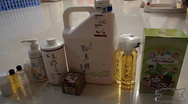 左邊四小罐是試用品,其他的則是(左至右)洗衣精、洗手慕絲、環境清潔劑、木酢丸和木酢液